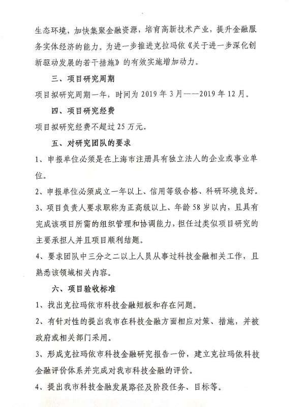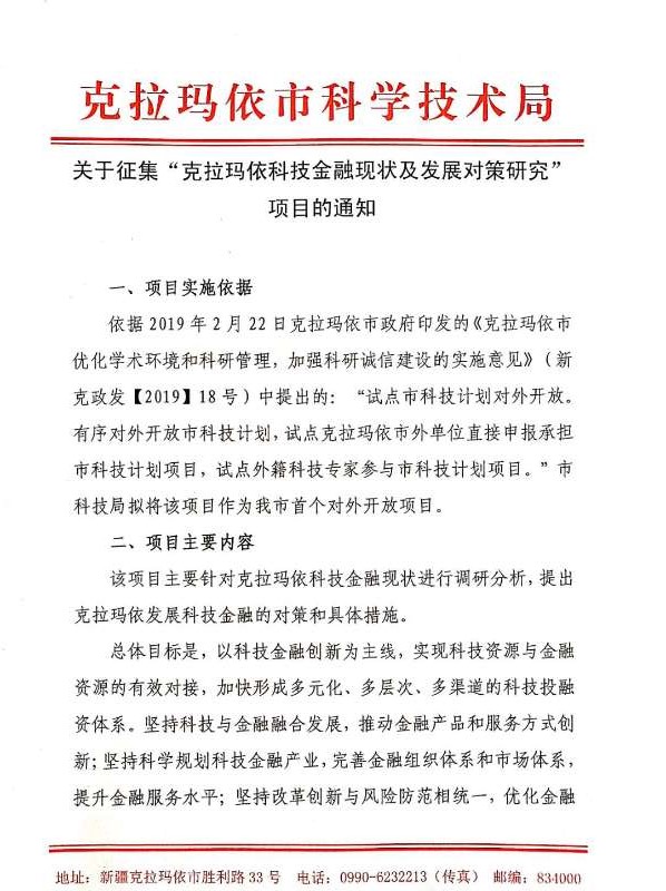 关于征集“克拉玛依科技金融现状及发展对策研究”项目的通知