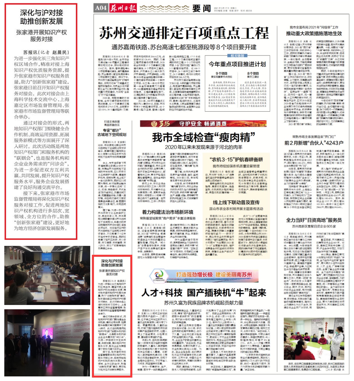 为深入学习贯彻习近平总书记关于长三角更高质量一体化发展及全面加强知识产权保护工作的讲话精神,促进沪张两地知识产权机构深入合作,推动两地协同创新,3月12日,“2021上海知识产权服务机构张家港行”活动成功举办。本次活动由上海科工联科创科技服务中心、上海市嘉定区市场监督管理局、张家港市市场监督管理局、张家港市人大科教文卫(外事民宗侨台)工委联合主办,12家上海优秀知识产权服务机构赴张家港参加活动,“中心”党委副书记、副主任王亿书,上海市嘉定区市场监督管理局知识产权科长张伟春,张家港市市场监督管理局副局长孙跃忠,张家港市人大科教文卫工委副主任张天若等领导出席了活动。