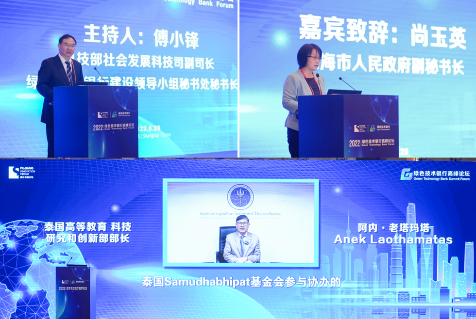 傅小锋副司长宣读了张雨东副部长的致辞,指出建设绿色技术银行是中国落实《联合国2030年可持续发展议程》的重要举措,绿色低碳的时代背景下,希望各方进一步把握绿色技术银行的历史使命,加强专业化队伍和市场机制能力建设,瞄准国内国际两个市场,加强绿色技术的国际交流合作。尚玉英副秘书长在致辞中表示,五年多来,在国家科技部的悉心指导下,上海市全力推进绿色技术银行建设,面对未来“双碳”新机遇和低碳发展新要求,绿色技术银行要进一步找准发展定位,发挥好综合性服务平台的资源集聚作用和示范效应,为上海的绿色低碳转型发展贡献力量。泰国高等教育、科技、研究和创新部部长阿内•老塔玛塔在祝贺视频中表示,泰国作为“一带一路”沿线节点国家,与中国在推广绿色技术应用、落实《联合国2030年可持续发展议程》和实现可持续发展方面目标一致。通过本次绿色技术银行高峰论坛及专题论坛的举办,泰中科研院所、高校、企业可以在环保、节能减排、基础设施建设、绿色金融服务、金融科技等领域将进一步加强交流和互动。